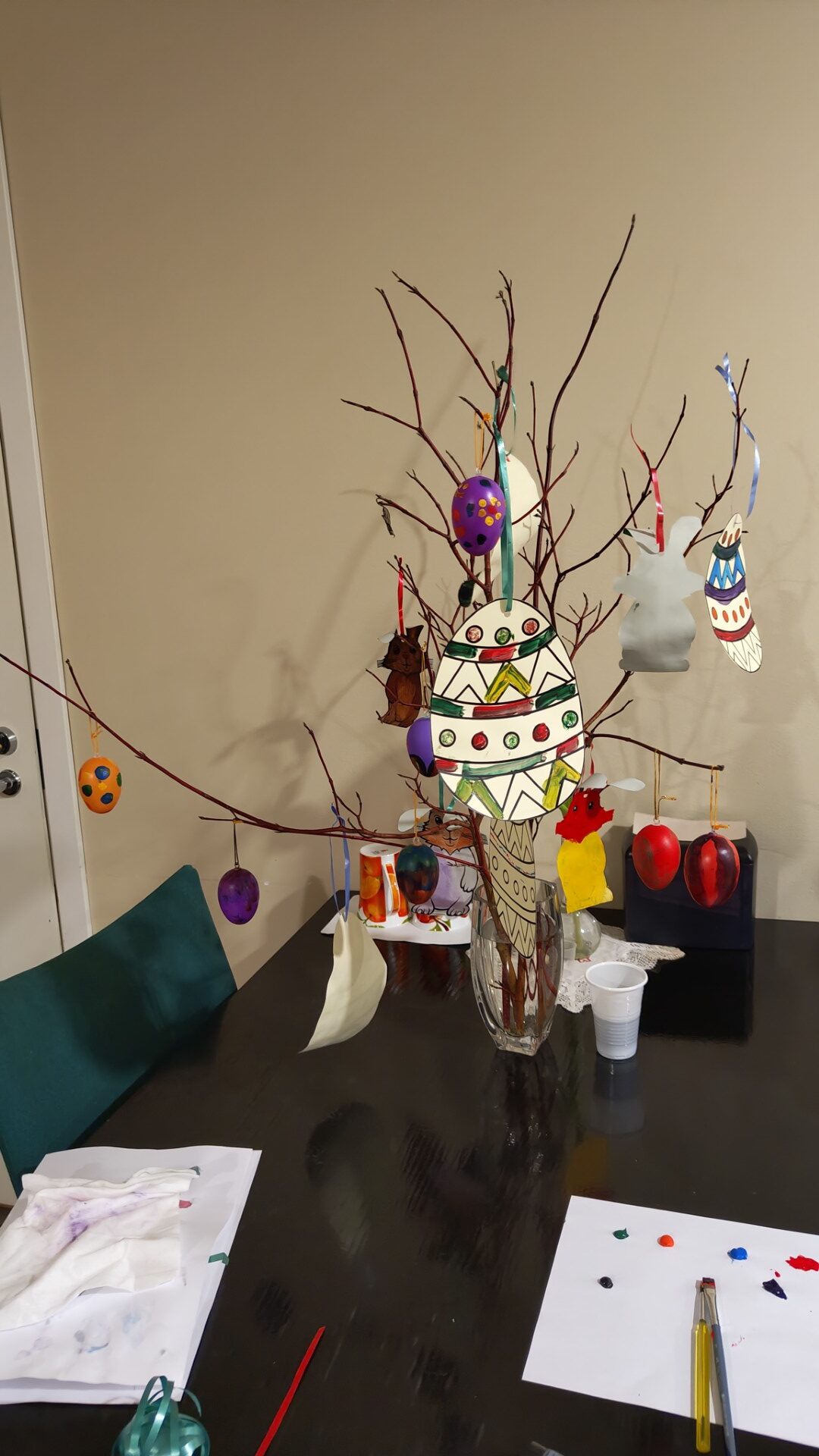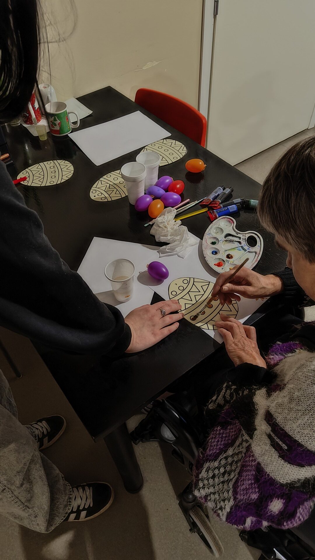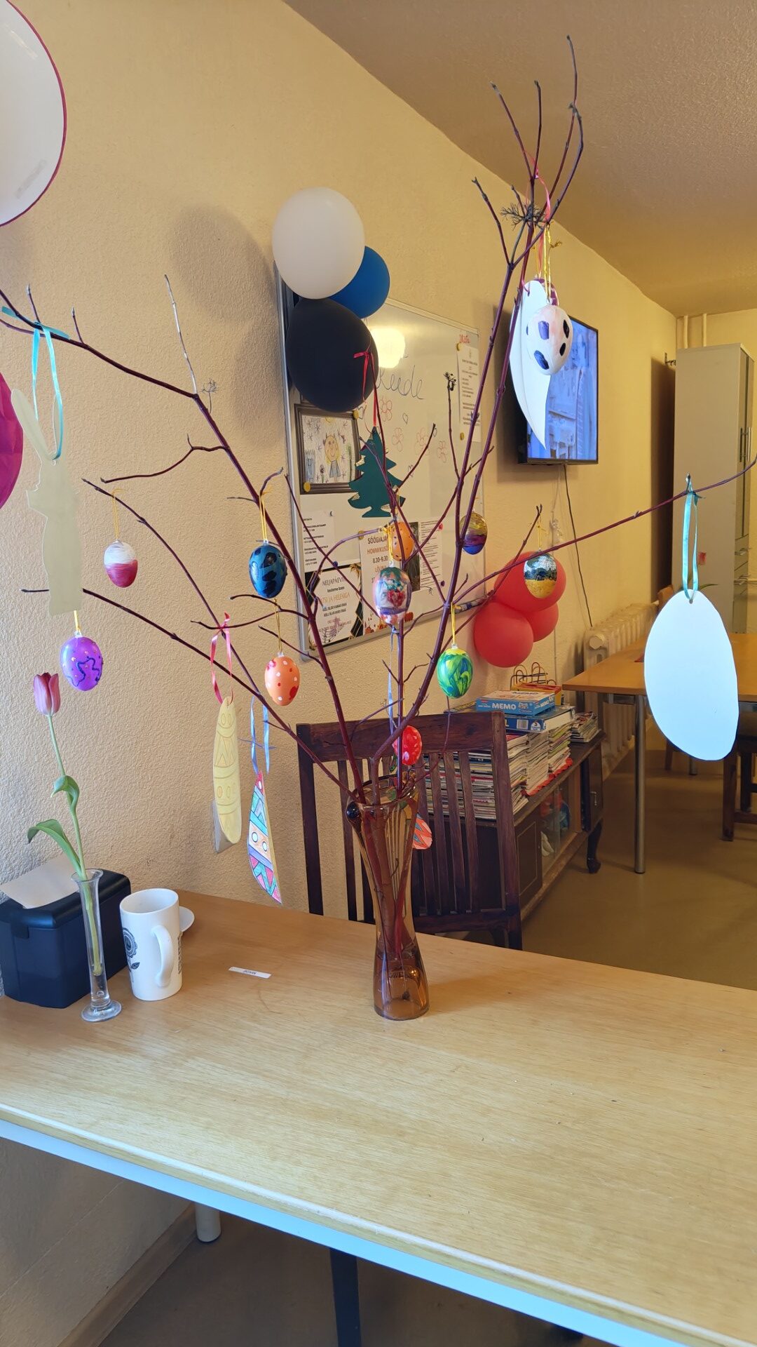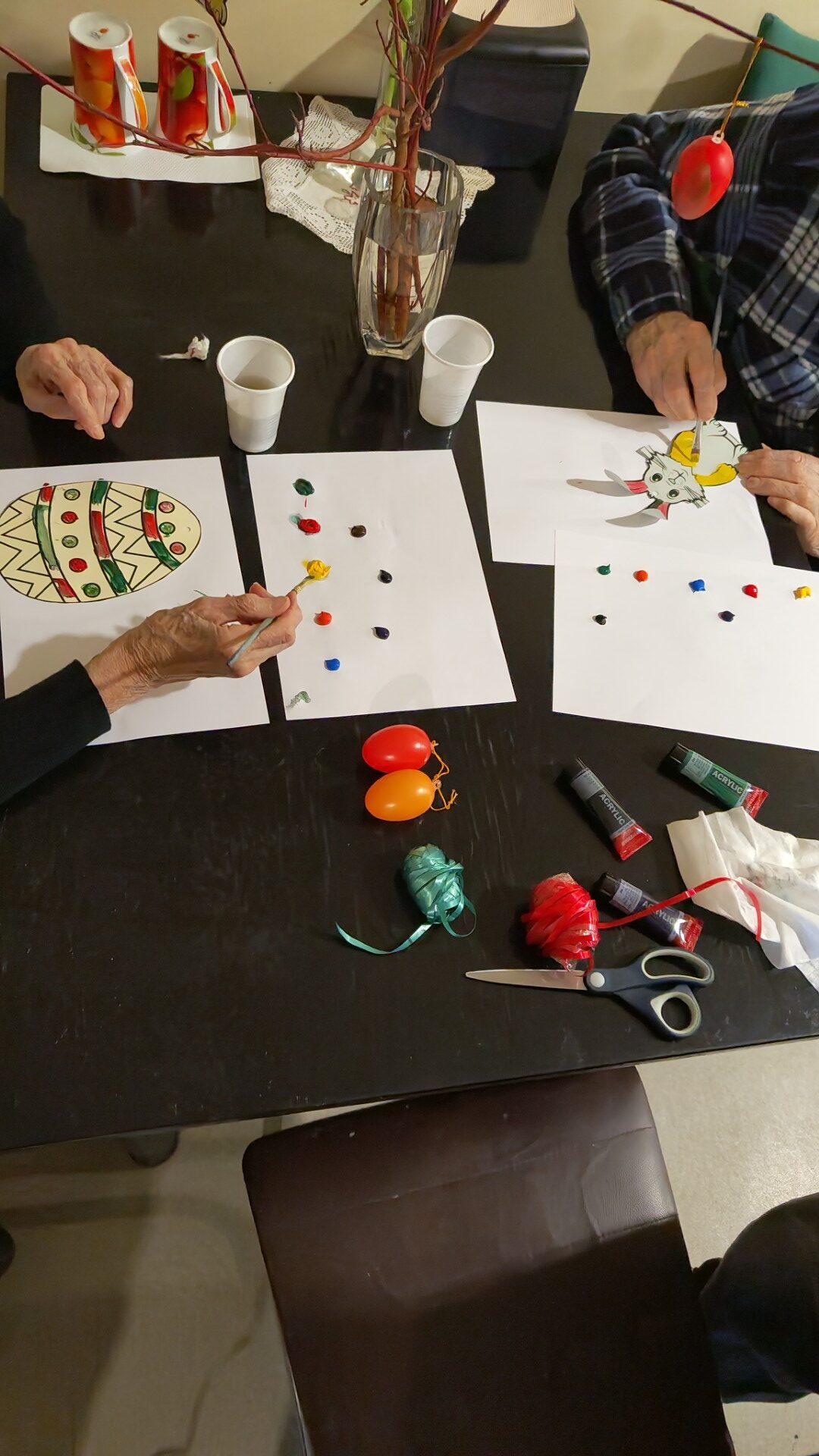 Kuna töötajatel oli tänuüritus, siis oli vaja abilisi, kes vanuritega toimetaksid.Koos aeti juttu, värviti mune ja jäneseid ning kaunistati eelseisvateks lihavõttepühadeks kevadine puuoks.