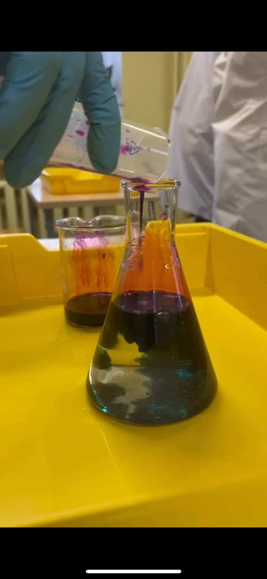 Neljandas katses uurisime mangaani oksüdatsiooniastme muutumisel kaasnevate värvide vahetumist. Tulemuseks muutus koonilisse kolbi lisatud lillat värvi lahus alguses tumeroheliseks, siis punakaspruuniks.